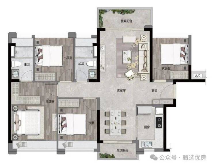 112-127㎡四房两厅两卫:改善型主力户型,南北双阳台设计,270° 环幕视野,通风采光效果极佳。客厅开间宽敞,可容纳全家休闲活动;四个卧室空间均衡,主卧套房带独立衣帽间与卫生间,次卧可灵活改造为书房、儿童房或客房;厨房为 U 型设计,操作动线流畅,适合三口之家、二胎家庭或与老人同住的家庭,空间利用率高,居住舒适度拉满。