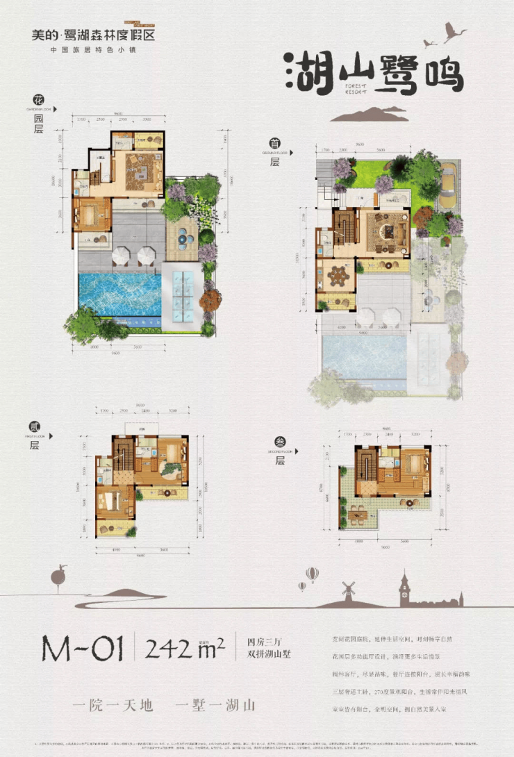 美的·鹭湖森林度假区的双拼别墅,宛如一颗颗璀璨的明珠,镶嵌在度假区的湖光山色之间。从户型图来看,这些双拼别墅不仅面积宽敞,而且设计精巧,充分体现了舒适与奢华的完美结合。