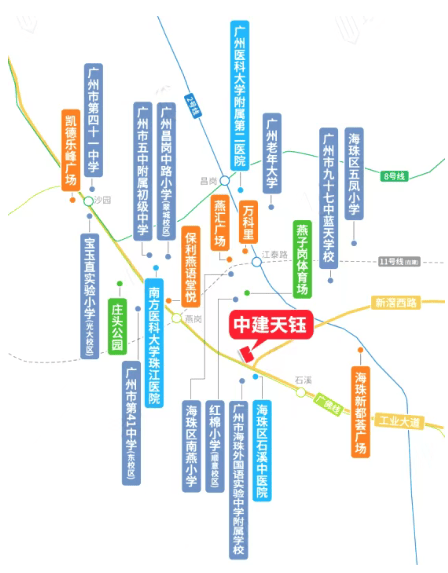 中建天钰位于广州市海珠区西部核心区域,紧邻石溪村旧改项目,随着旧改进度加速,为该地区带来了新的活力和发展潜力。项目距离广佛线石溪站约720米,交通便捷,且临近广州地铁11号线和10号线,公共交通网络发达,出行十分便利。
