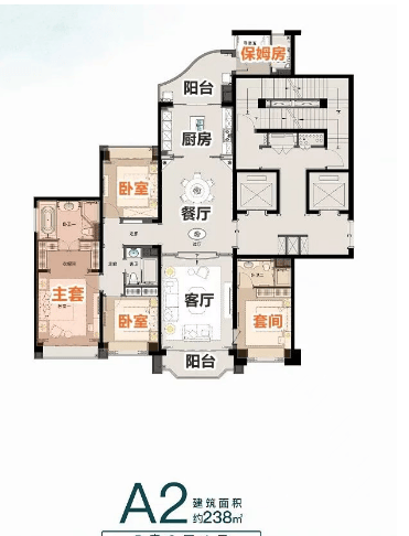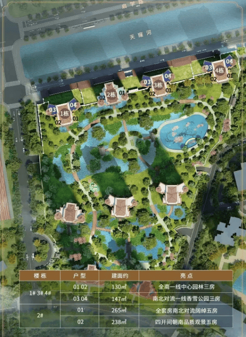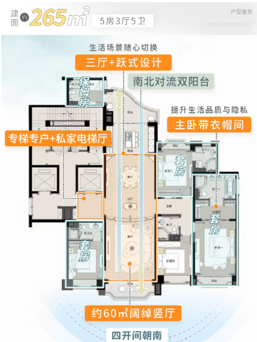 建筑面积:涵盖从130 m²到265 m²不等,包括三房两厅两卫至五房三厅五卫等多种户型选择。