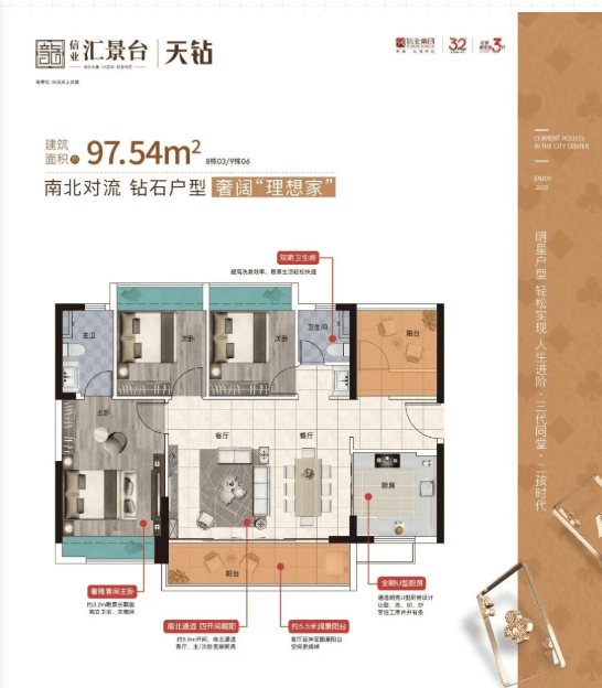97㎡钻石布局:南北双阳台设计,南北通透,独立家政间,适合需要更多私人空间的家庭。