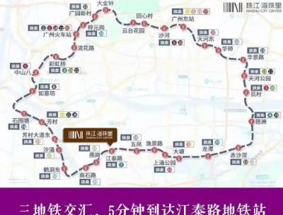 项目周边交通网络十分发达,已运营的 2 号线、8 号线和广佛线,加上在建中的 10 号线、11 号线,形成了 5 地铁环绕的便捷格局。距离最近的 2 号线江泰路地铁站约 1.3 公里,步行可达。地铁站出来便是年轻人喜爱打卡的万科里商场,让您的出行与购物无缝衔接。此外,附近交通路网纵横交错,驱车前往琶洲、珠江新城、金融城等地都十分便捷,无论是日常通勤还是出行游玩,都能轻松实现,大大节省您的时间成本。
