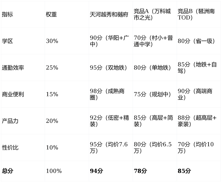 结论:越秀天悦金沙综合得分93分,显著优于竞品。