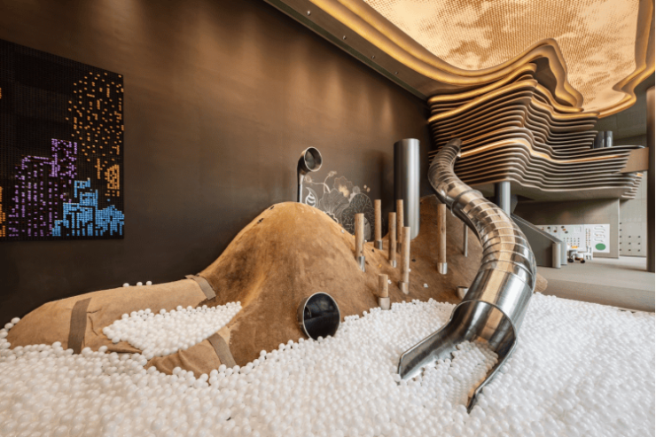 地库归家采用广州首创的双首层坡道设计,进入负二层与负一层一样便捷。地库落客区吊顶设计采用了“星空银河”的概念,通过穿孔铝板营造出宇宙星河氛围,自然灵动。同时地库还配置了自助洗车区域、智能社区垃圾回收系统等。