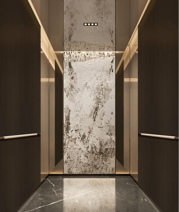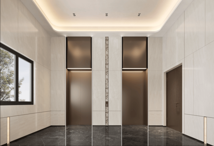电梯厅全明采光,采用大尺寸瓷砖与石材,搭配仿古铜金属电梯装饰,尽显高端品质。