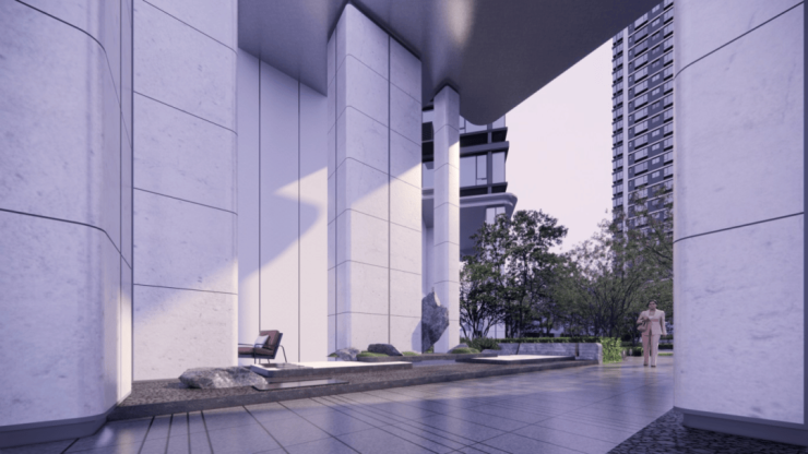 4.5-9米挑高首层大堂,外部立柱采用独特蘑菇柱造型,选用三维曲面铝合金、银白色铝板、葡萄牙米白石材、超白玻中空玻璃等高品质材料,酒店级的高端与大气。