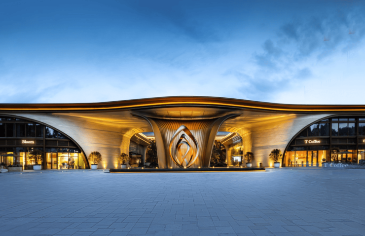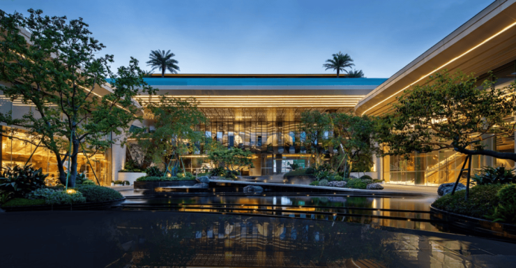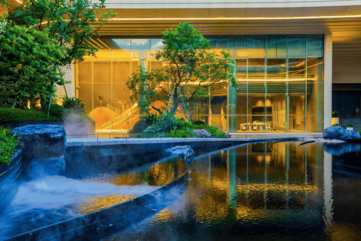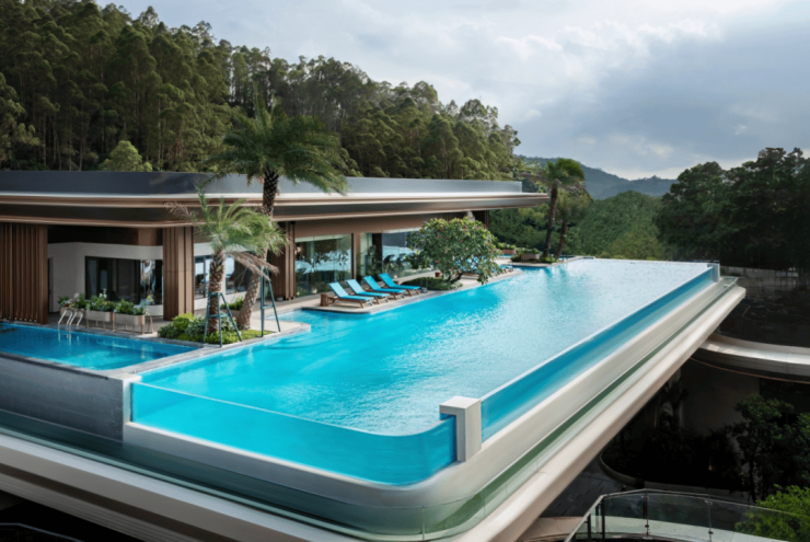 宽约60米、高约10米的气派府门,搭配酒店级环岛式落客区,约2000㎡“四水归堂”格局的下沉庭院,三层半山高定会所,无边际星空泳池,超43%窗地比全玻璃公建化外立面。