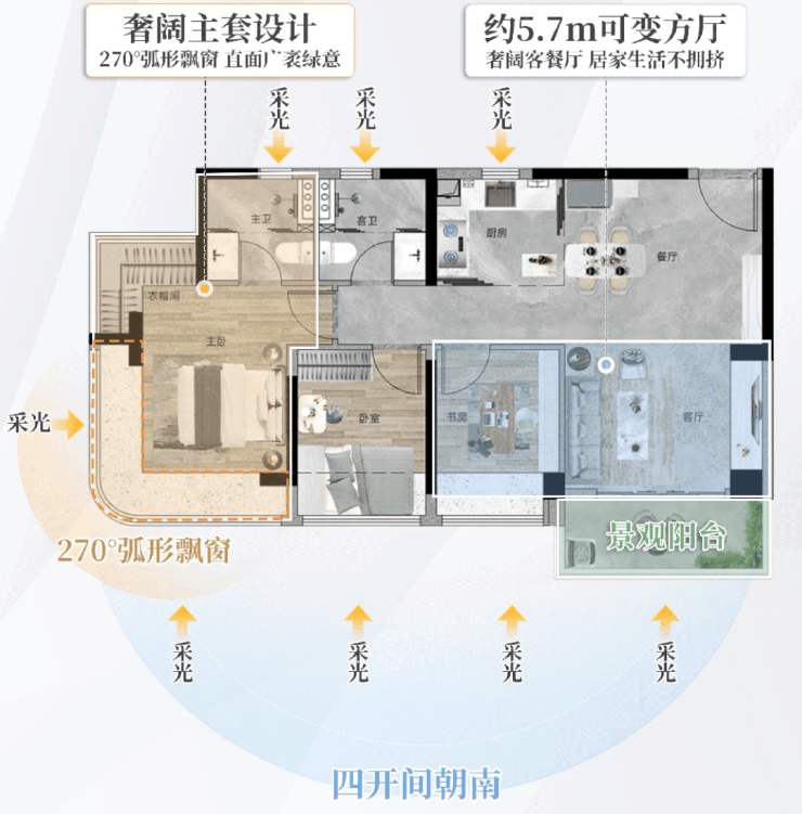 •主卧270°弧形飘窗,目之所及皆风景