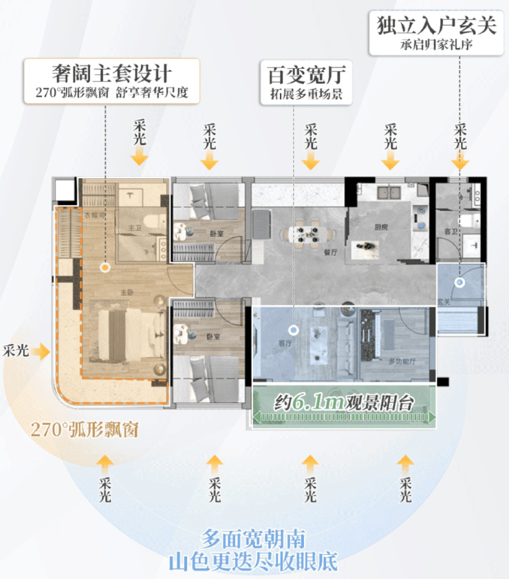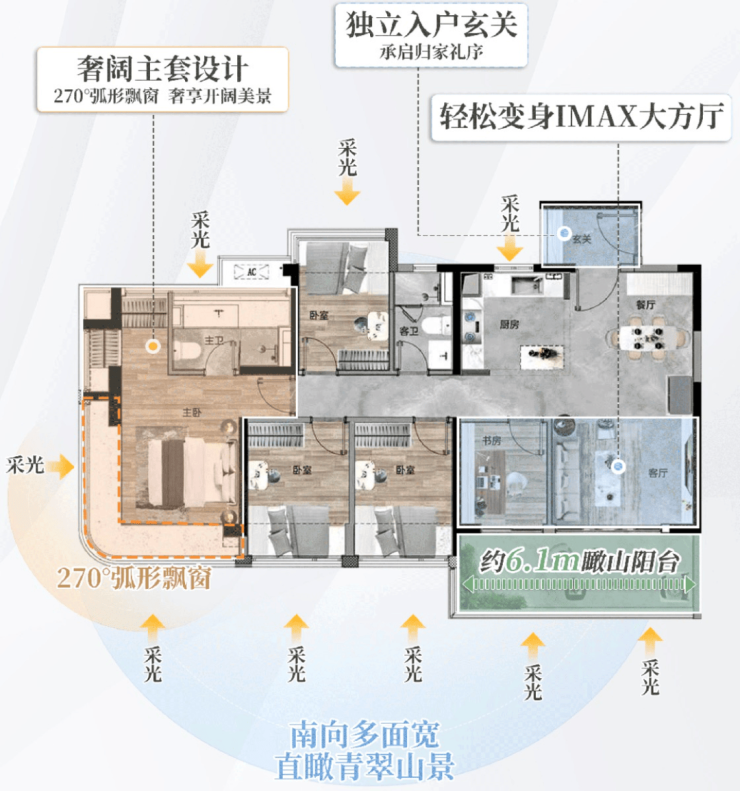 100㎡四房两厅两卫,约6.1m超大景观阳台,四开间朝南,竖厅南北对流,主卧270°弧形飘窗,超100%使用率