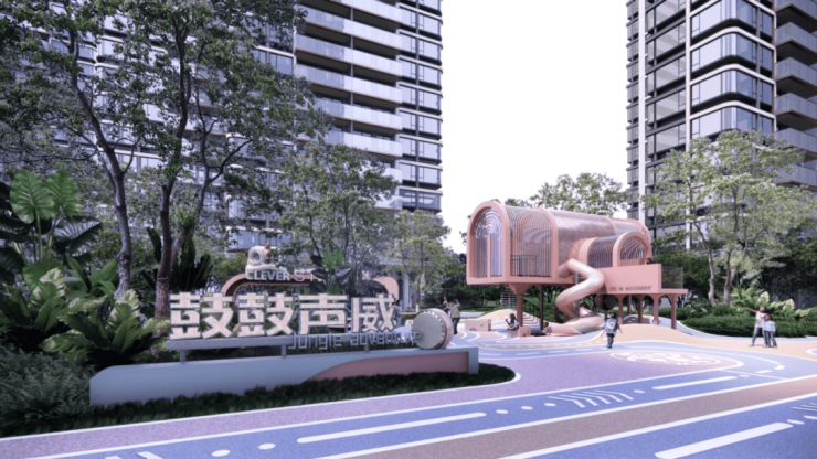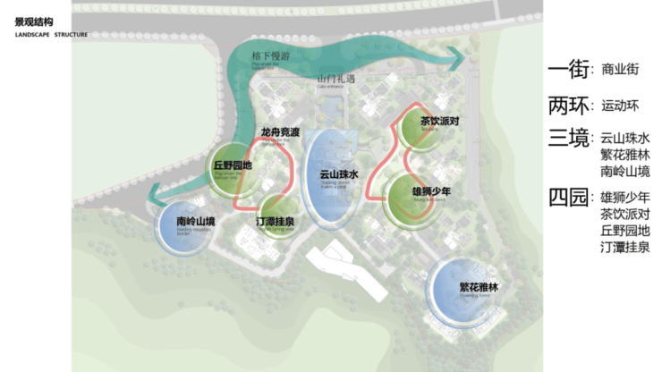 项目园林结合广府属地文化精粹,打造“一街、两环、三境、四园”景观节点。一街为榕下漫游商业街;两环为东侧300米跑道和西侧200米跑道,在跑道不同区域配置有不同运动器材;三境为云山珠水、繁华雅林、南岭山境;四园为雄狮少年、茶饮派对、丘野园地、汀潭挂泉;整体园林营造全龄社交剧场。