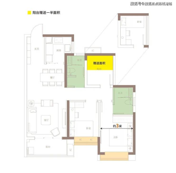 3米开间主卧自带独立卫生间、全景大飘窗