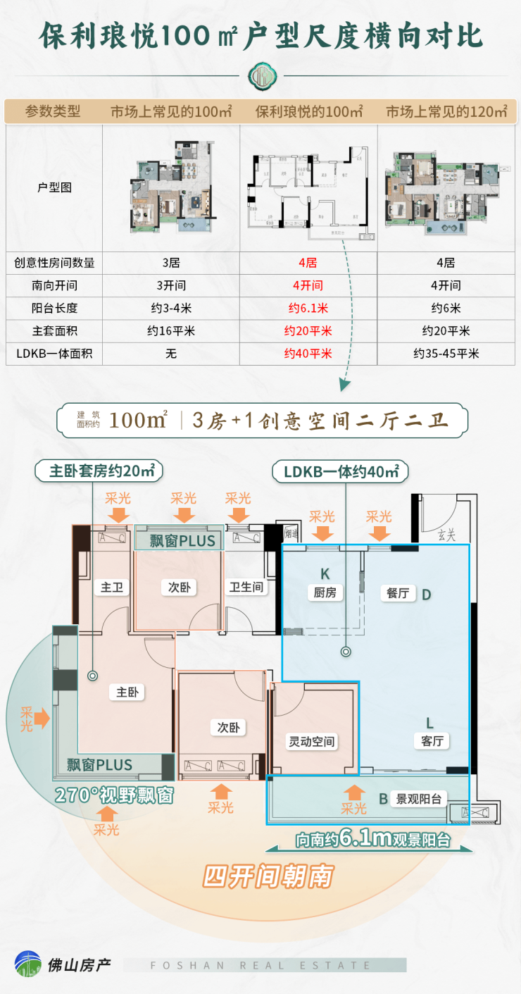 【保利琅悦】以高品质改善型产品著称,主推建面约89㎡至173㎡的三房、四房户型,满足不同家庭阶段的居住需求。新品建面约100㎡户型实现南向四开间布局,功能结构科学合理,LDKB一体化设计使客餐厅空间一气呵成,开阔舒适。主卧拥有270°巨幕视野与约20㎡套间空间,阳台开间约6.1米,居家采光与景观视野极佳。项目创新采用飘窗PLUS设计及非承重墙结构,让户型改造更灵活,空间利用率高达100%。每户皆为独立通风采光单元,空间布局动静分离,功能分区明确。相较同面积段产品,【保利琅悦】使用率更高、尺度更阔,兼具居住舒适度与资产稀缺性,是佛山改善人群心中的“理想户型范本”。