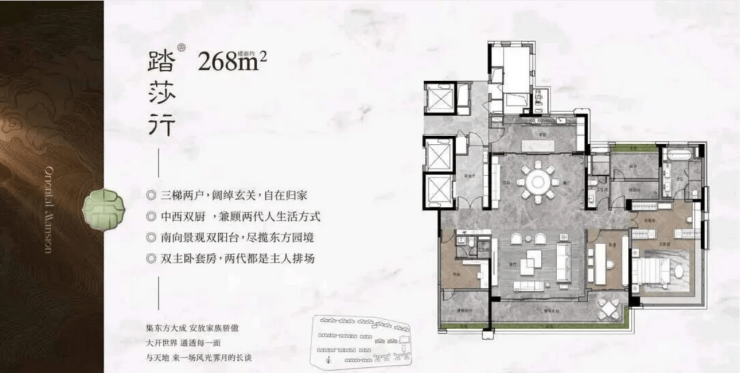 建面约268㎡改善大平层:旗舰户型,关注度相对较低,剩余房源约10套,三梯两户含独立保姆电梯,LDKG大方厅面积近120㎡,定位高端,适合大型家庭居住。