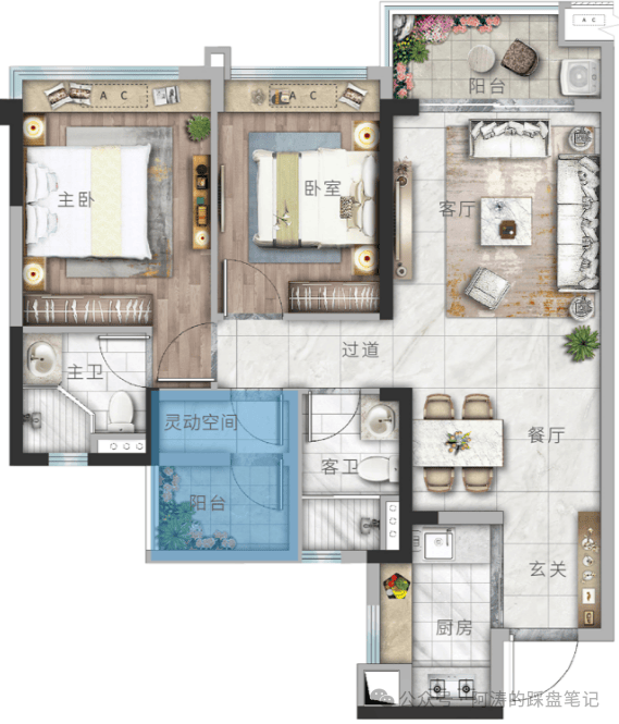 灵动空间:南北通透双阳台设计,餐客厅与阳台相连,空间灵活多变,可根据实际需求改造。