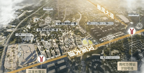 距离地铁3号线、7号线汉溪长隆站约500米,步行约8分钟;距离地铁18号线南村万博站约1.2公里。