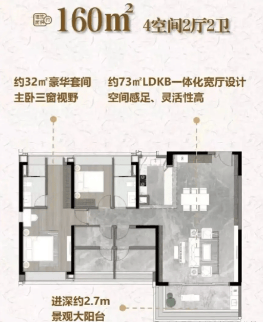 160㎡四房两厅两卫户型,总价900万-1300万,低楼层房源总价可控制在千万内,采用2梯3户格局。横厅设计搭配7米观景阳台,望江视野更开阔,次卧空间宽敞,可改造成书房或儿童房,空间灵活性高。这种大横厅设计,不仅提升了客厅的气派感,也让家庭成员之间的互动更加顺畅。