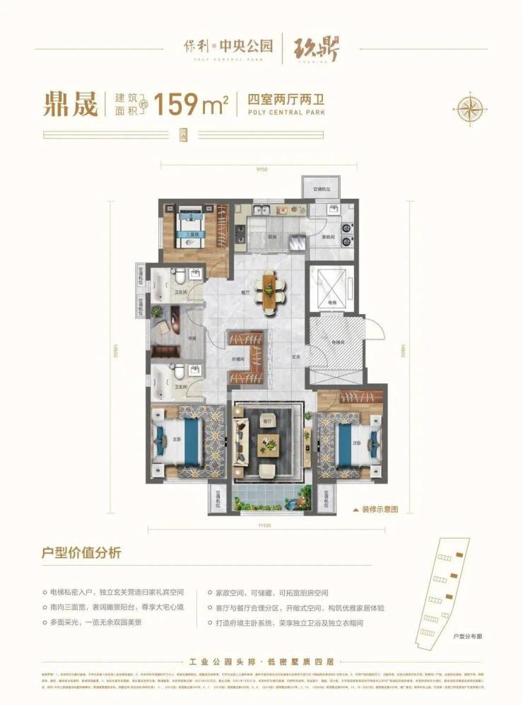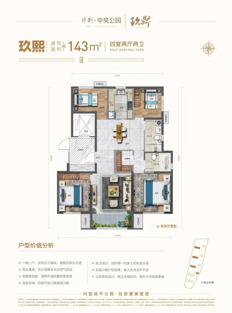 户型亮点:园景四房设计,户型方正,动静分区合理;四开间朝南,全景采光,阳光铺满全屋;客厅连通超大景观阳台,直面社区中央园林,推窗即景;主卧套房设计,带独立卫浴、飘窗,尊享私密奢居;灵动 + 1 房,可作为儿童房、老人房、书房,满足二胎家庭、三代同堂居住需求;双卫干湿分离,保持室内干爽整洁。