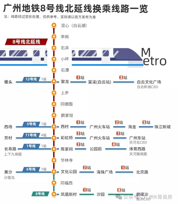 2025 年白云站 TOD 全面投运,作为广州西部综合交通枢纽,集高铁、城际、地铁于一体,项目乘坐 8 号线 3 站直达,进一步强化湾区通达能力,这一交通升级为板块价值注入新动力。克而瑞数据显示,地铁 8 号线沿线物业在 2025 年广州楼市中表现稳健,成交活跃度高于非地铁沿线项目,凸显轨道交通对居住价值的支撑作用。