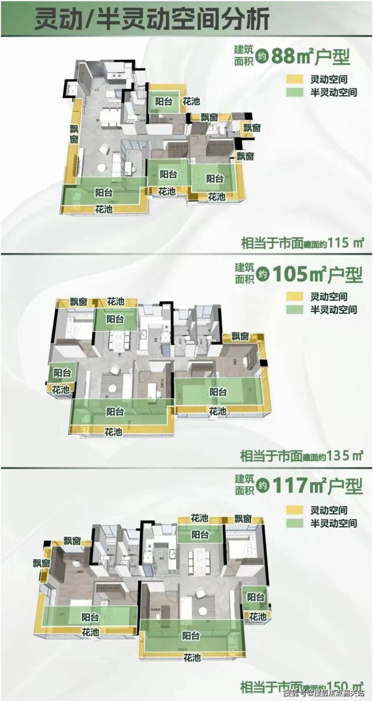A:依托广州住宅新规,阳台报建送一半面积,飘窗优化空间,连片收纳系统减少浪费,实测88㎡户型得房率相当于市面115㎡产品。