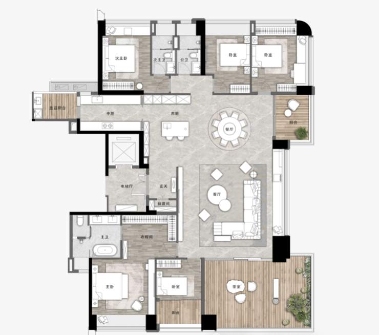 该组团的大平层产品,在装修标准上也进行了升级,采用更高端的装修材料和品牌家电,配备全屋智能家居系统,能实现灯光、窗帘、空调等设备的智能控制,提升居住的便捷性和舒适度。同时,户型设计上注重私密性和仪式感,主卧套房配备独立衣帽间、卫浴和书房,既能满足主人的居住需求,也能提供一个安静的办公、阅读空间。