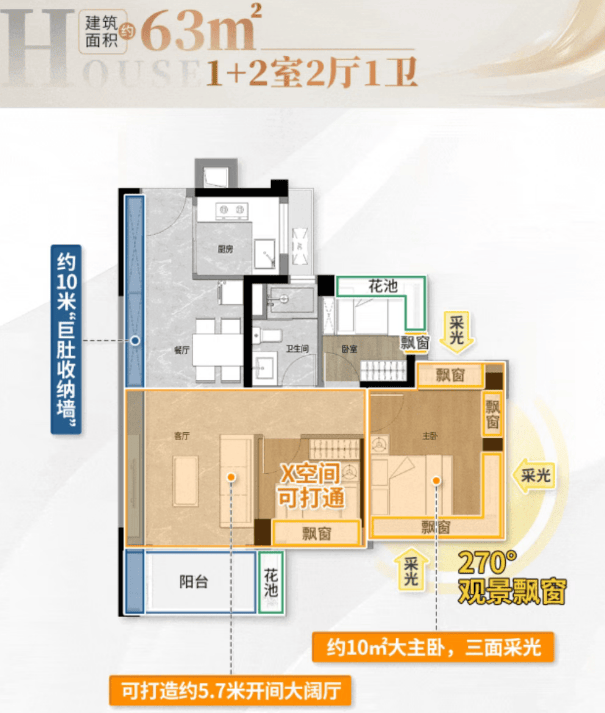 特点:最高可达107%实用率,主卧U型全景飘窗,三开间约9米大采光面,LDKB一体化设计,动区宽敞明亮。