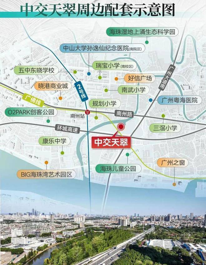 交通便利性是南洲板块的传统优势。中交天翠距离地铁2号线与广佛线换乘站南洲站直线距离仅约400米,未来规划桥梁连接,步行通勤轻松可达。周边广州大道和环城高速环绕,自驾前往珠江新城、天河、番禺等地都十分快捷,满足日常上班、上学、出行需求。