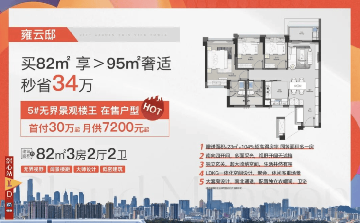 雍云邸主推78、82和89㎡的新规户型,户户超100%使用率,三房至四房布局合理。78㎡三房两卫户型同等面积多一房,LDK互动布局实现多功能空间利用。89㎡四房两卫户型南向采光良好,约11米宽采光面保证室内明亮通风。全户型四开间朝阳设计,主卧配备大套房及全景飘窗,兼顾空间灵动性与美学感受,为家庭成员提供舒适、实用、赏心悦目的居住环境,实现现代住宅对舒适度和功能性的双重要求。