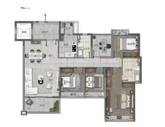 户型完全动静分区,但同时形成了长走廊占据了部分面积。4个卧室均带飘窗,主卧还有步入式衣帽间及独立卫浴。“+1房”目测面积较小,可用作书房或休闲室。