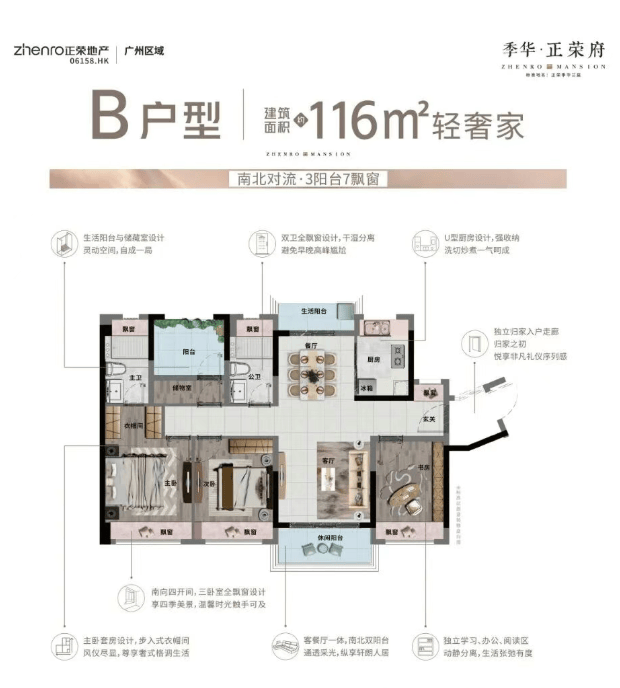 值得一提的是,2026年佛山出台《关于推进“好房子”建设的实施指引》,取消对单个阳台的进深和面积限制,套内阳台的“折半”计容面积上限由套内建筑面积的18%提高至20%,取消凸(飘)窗窗台与地面高差小于0.45米需计容的要求[5]。季华·正荣府的户型设计恰好契合这一政策利好,大量采用阳台、飘窗设计,不仅提升了户型的使用率,更增加了居住空间的延展性,让业主能够获得更多实用空间,真正实现“买得值、住得舒”。