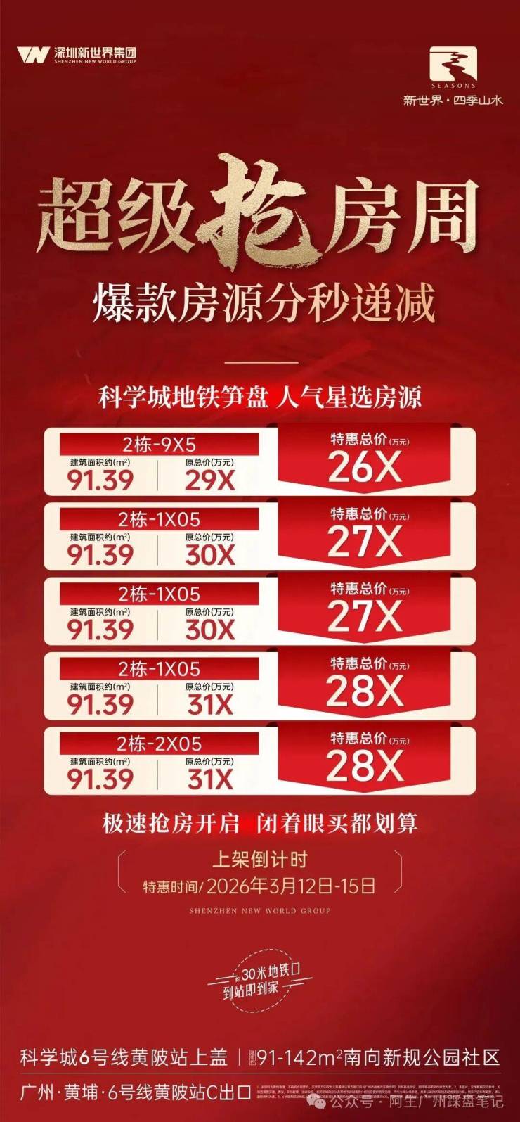 新世界·四季山水作为科学城首个地铁上盖南向新规新房,具备极高的性价比,参考单价约31000元每平方米,总价区间为290万至400万每套,在科学城核心板块处于合理价格区间,相较于同板块同类型项目,价格优势明显。项目最大的价格优势的是超高实用率,实用率达114%至118%,相当于降低了实际购房成本,以92平方米三房为例,实用面积达105平方米,实际单价仅约27600元每平方米,远低于同板块常规住宅单价。同时,项目为精装修交付,装修标准约2000元每平方米,业主无需额外投入装修成本,进一步降低购房压力。项目总价290万起即可购买三房两卫,门槛适中,既能满足刚需家庭的购房需求,也能满足刚改家庭的改善需求。结合项目地铁上盖、名校环绕、生态优越、配套完善等核心优势,其性价比在科学城板块处于领先水平,无论是自住还是投资,都具备极高的价值,是科学城板块刚需与改善人群的优选楼盘。