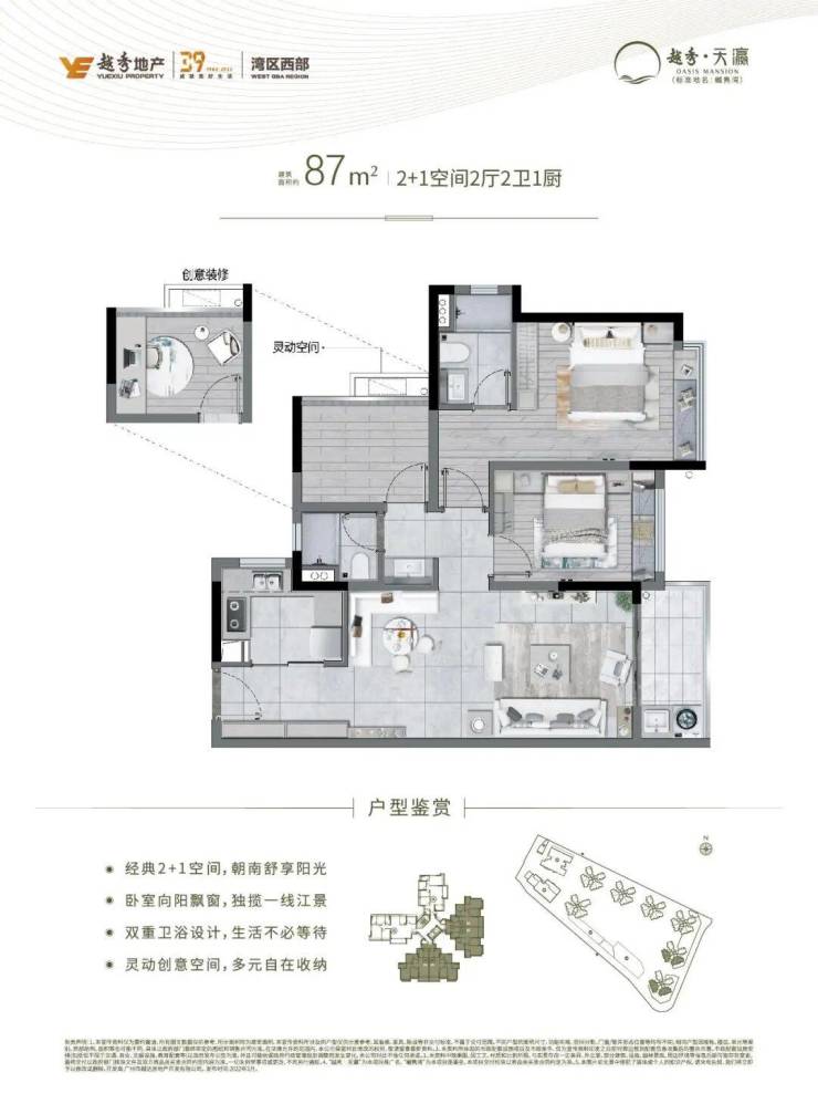 - 越秀·天瀛秉持匠心品质,注重实用功能,采用国际一线标准交付,配备智能家居,营造极致生活,成就理想生活新范式。户型方面亮点突出,约87㎡三房两卫是绝版望江三房,是上车首选,满足刚需购房者需求。约104㎡四房两卫望江极致四房,适合改善型购房者。约125㎡五房两卫瞰江通透格局,为王牌臻藏户型,满足对空间与景观有更高要求的客户。各户型设计合理,充分利用空间,结合江景资源,为不同需求的购房者提供理想人居范本。售楼处电话:提供购房咨询的联系方式400 - 622 - 0051。