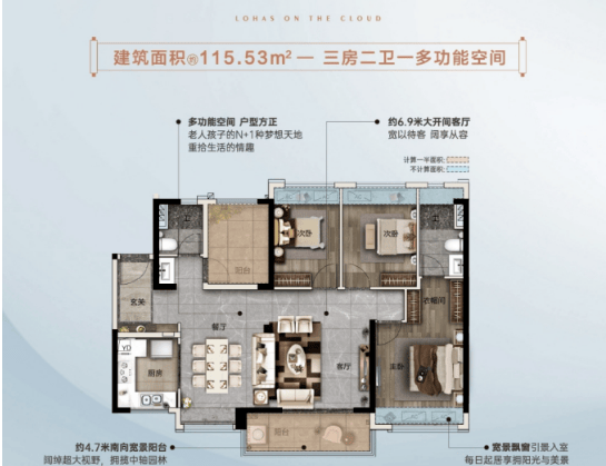 115㎡四房:刚改主力,6.9 米横厅设计 + 4.7 米南向阳台,南北通透,LDK 一体化布局提升家庭互动空间,适配多人口家庭;