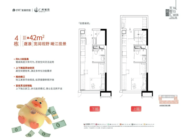 2. 42㎡一房一厅:南北通透,部分单位带江景阳台,自住舒适度高,总价45-55万,适合小夫妻或三口之家居住;
