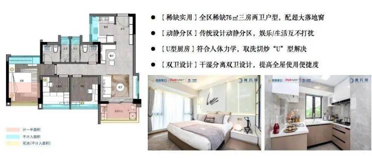 78㎡三房两卫:四开间朝南,U型厨房+餐客一体化设计,总价180万元起,首付54万元(3成首付),月供约1.2万元(按LPR4.2%计算);