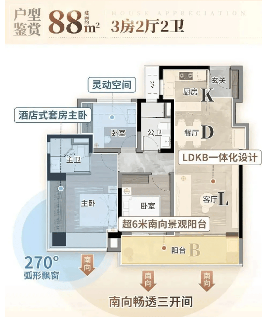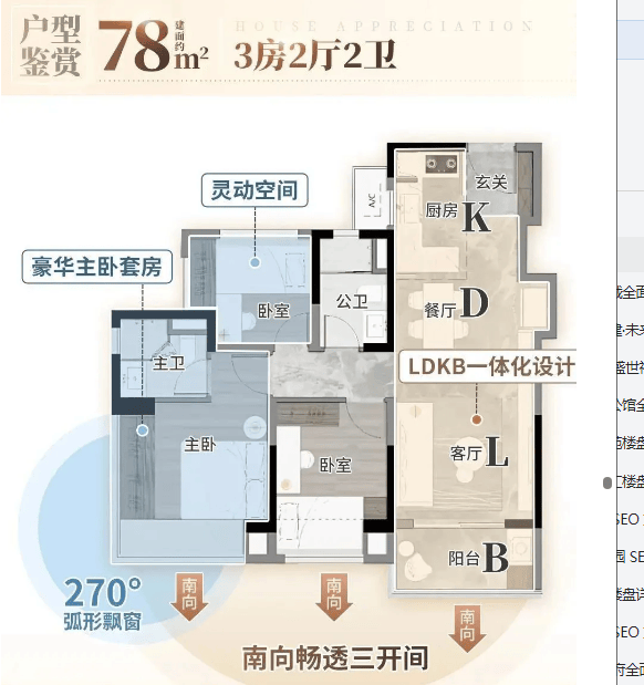 建面约78㎡三房两卫:刚需入门首选户型,全南向布局,采光通风极佳。户型紧凑实用,动静分区合理,主卧配备独立卫生间,保障私密性;赠送飘窗与阳台,拓展使用空间,满足三口之家日常居住需求,总价260万元起即可入手。