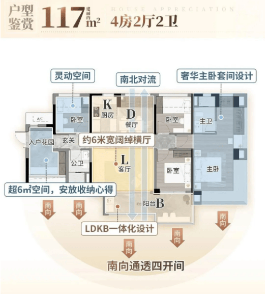 建面约117㎡“4+1”房两卫:全能户型,空间布局灵活,“4+1”可变空间可根据需求改造为书房、茶室或儿童游乐区。大面宽阳台连接客厅与主卧,尽享江景与园景,适合追求品质生活的改善家庭。