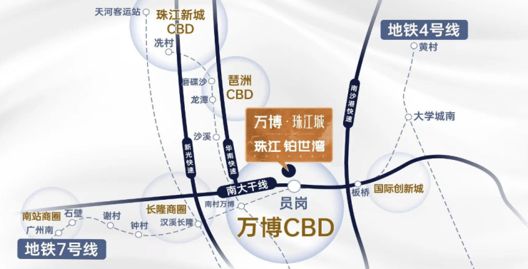 交通枢纽位置:万博珠江城紧邻地铁7号线员岗站,且可通过多条快速路便捷通达广州各大重要区域,极大地提高了居民的出行效率和生活便利度。