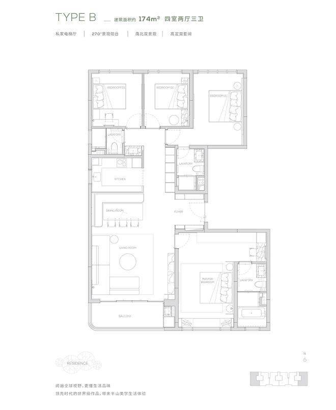 户型设计是缦云广州的一大核心亮点。项目提供建面约145至320平方米多种大面积户型选择,主要面向城市改善型及高端置业群体。145平方米户型强调家庭生活动线的合理组织,采用LDKB一体化空间布局,使客厅、餐厅、厨房与生活区域形成更强的空间互动性,同时通过大尺度观景窗引入自然光线,提升室内空间的明亮度与舒适度。174平方米及190平方米以上户型则更加注重高端居住体验,普遍配置270度环幕观景阳台设计,使居住者能够拥有更加开阔的城市与生态景观视野。部分户型还设置双套房结构,强化家庭成员之间的生活独立性。230平方米及264平方米户型更强调豪宅级生活质感,设置双阳台系统与步入式衣帽空间,使生活功能区划更加完整,体现出高端住宅对生活品质的深度理解。