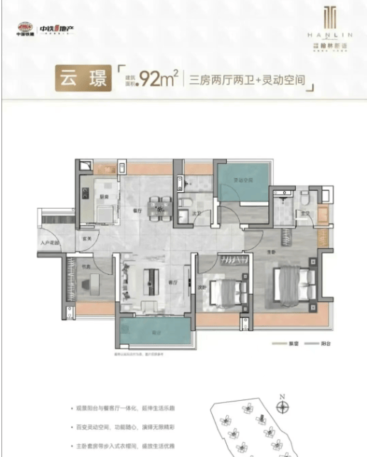 强调南北通透、动静分区、客餐厅一体化设计,居住舒适度和实用性兼顾。