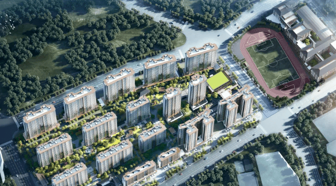 项目全部17栋住宅主体结构已全面封顶,外立面幕墙及窗户安装正在同步进行中。
