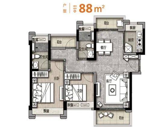 88㎡三房两卫:实得率高达90%,全屋赠送约11㎡,南北双阳台对流,通风采光俱佳,南向直面社区园林,居住舒适度媲美百平产品;