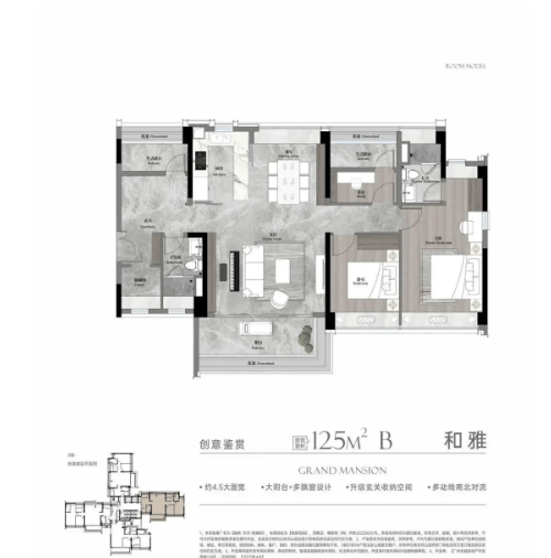 该户型采用2梯3户设计,私密性与舒适度远超常规2梯4户或6户布局。更令人惊艳的是其空间营造:南向实现约4.5开间面宽,LDKB一体化格局搭配3.1米层高,通透明亮;双南向套房设计,主卧配备临窗浴缸与多功能分区,真正实现“足不出卧”的奢适体验;近9米宽的景观阳台,不仅提升采光面,更为孩子预留了随年龄增长所需的私域空间。