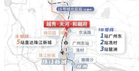越秀·天河和樾府落子广州城市中轴线北段,距离珠江新城仅约5公里,驱车20分钟即可畅达天河北、环市东等传统CBD。更重要的是,项目坐拥双地铁交汇的黄金交通格局:步行约400米即达地铁3号线梅花园站,2站直达广州东站,无缝衔接高铁与机场;而正在建设中的18号线北延段京溪路站(预计2026年开通),距项目仅约850米,未来1站到东站、2站抵冼村、3站达琶洲,真正实现“黄金轴线上的高效通勤”。