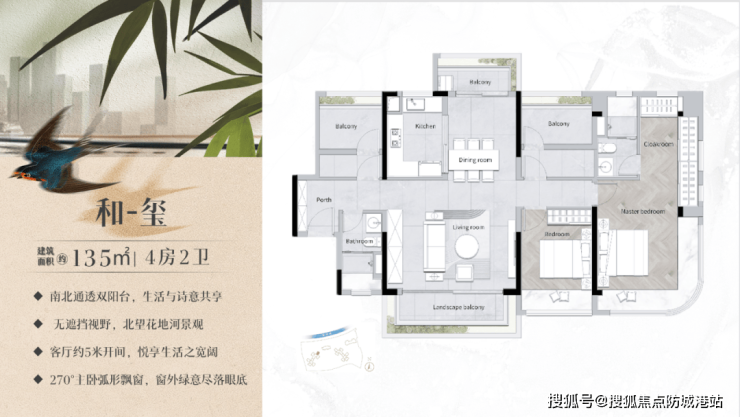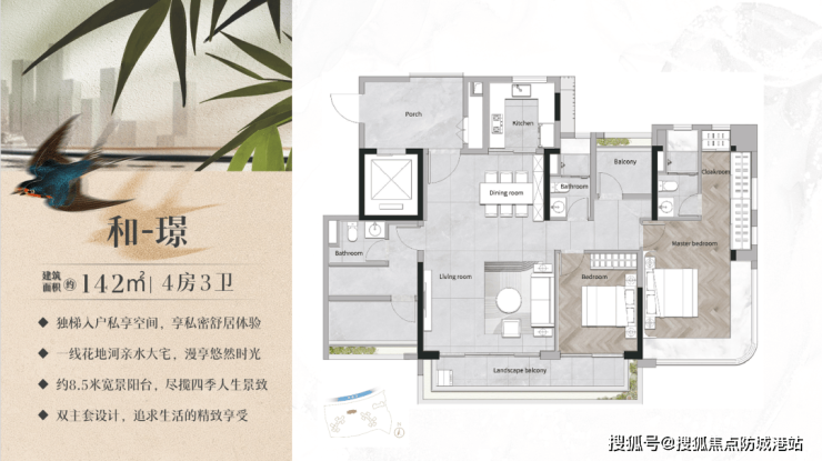 142㎡五房:双主套设计,270°景观阳台,总价820万起。