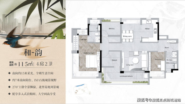 115㎡四房:南北通透,主卧带独立衣帽间,总价530万起。