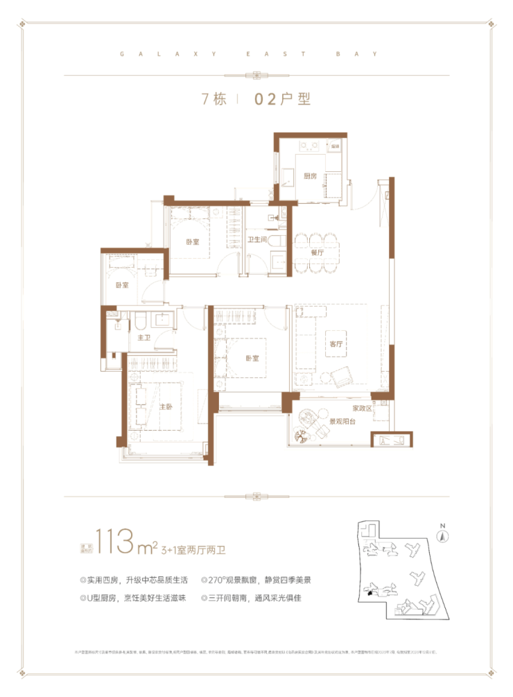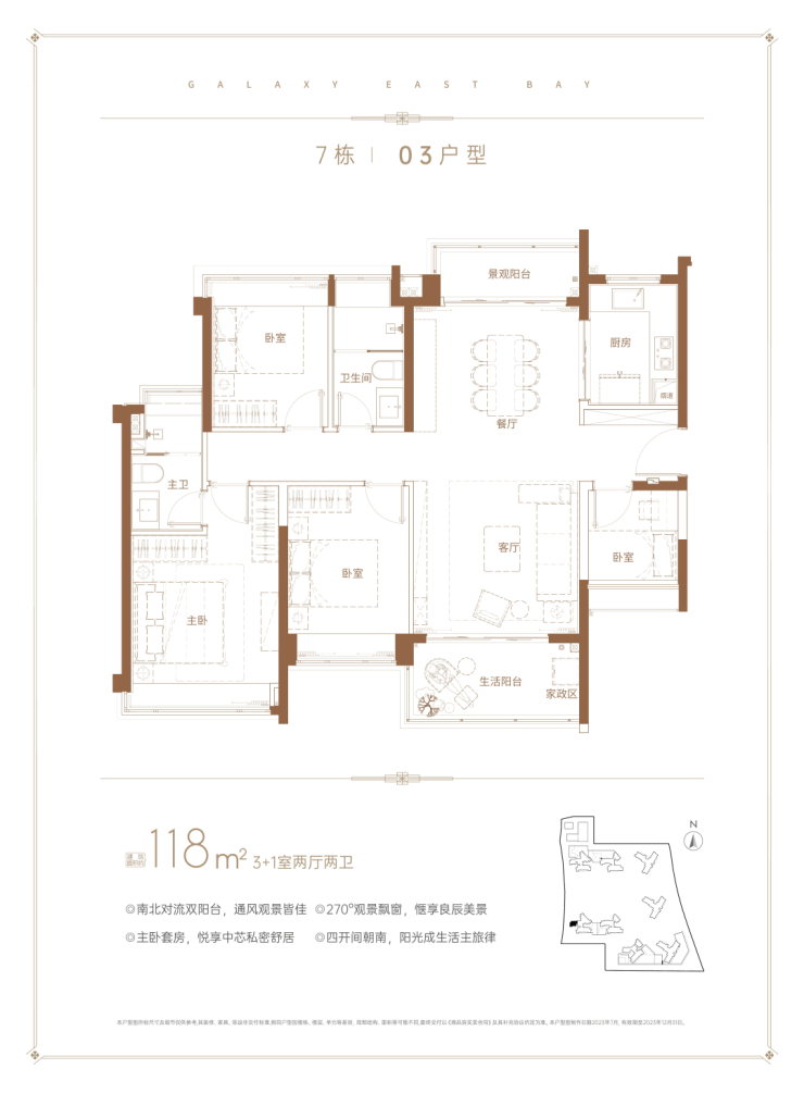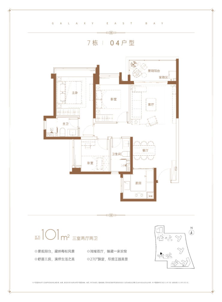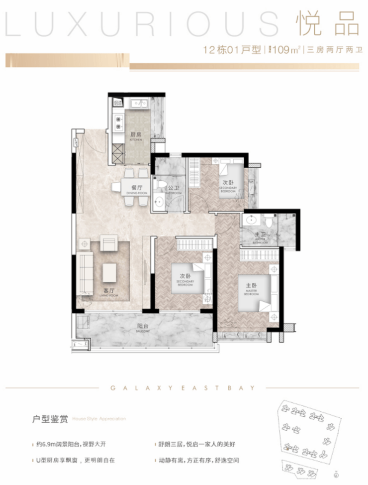 01户型(109㎡):轻奢三房,三开间朝南,超大景观阳台,西南侧可看山景;