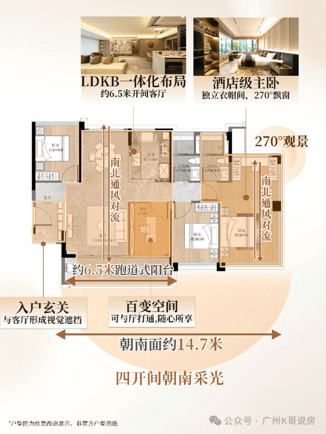 约14.7米南向面宽,餐客厅+主卧均南北通透,清风时时流连