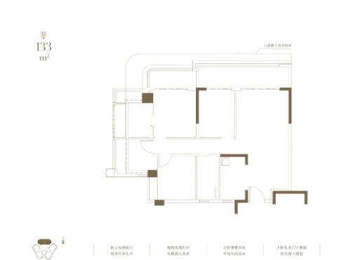 【B户型】约133㎡四房两厅两卫:经典四房设计,布局合理,动静分离,休闲、居住互不干扰。客厅宽敞明亮,连接超大观景阳台,通风采光效果极佳,日常休闲、接待宾客都极为合适;四个卧室均格局方正,采光充足,其中主卧配备独立卫生间和衣帽间,彰显高端品质,满足业主对舒适生活的追求;厨房采用U型设计,操作空间充足,方便日常烹饪。