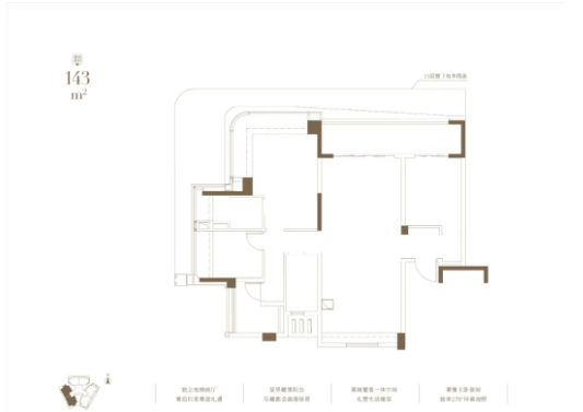 【C户型】约143㎡四房两厅两卫:奢阔四房格局,空间宽敞,布局合理,尽显高端人居格调。客厅与餐厅相连,形成超大活动空间,连接观景阳台,视野开阔,采光通风俱佳;卧室均配备飘窗,增加使用空间的同时,也提升了居住舒适度,主卧配备独立卫生间、衣帽间,私密性强,满足业主的高品质居住需求;公共卫生间干湿分离,使用便捷,避免潮湿困扰。