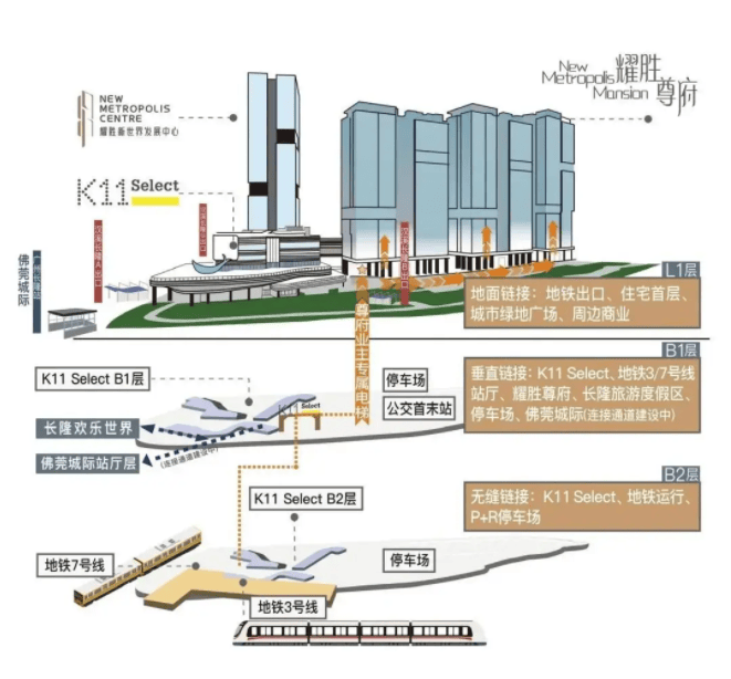 所谓“三轨”,指的是地铁3号线、地铁7号线以及佛莞城际铁路。这三条交通大动脉在耀胜新世界脚下交汇,形成了一个立体的交通网络,将广州乃至大湾区的核心区域紧密连接在一起。